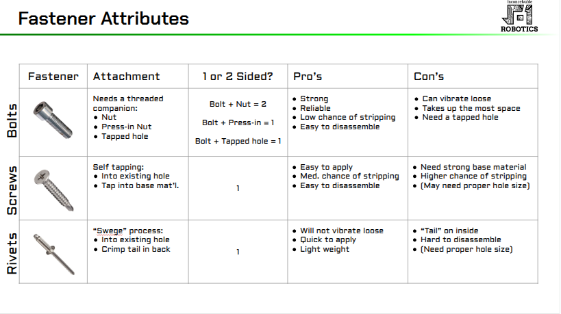 Fasteners This page is not finished! If you are a team member and know more about this topic than what is currently here please contribute that information. Further Reading Fastener Presentation 2025 Backlinks No other pages link to this page.